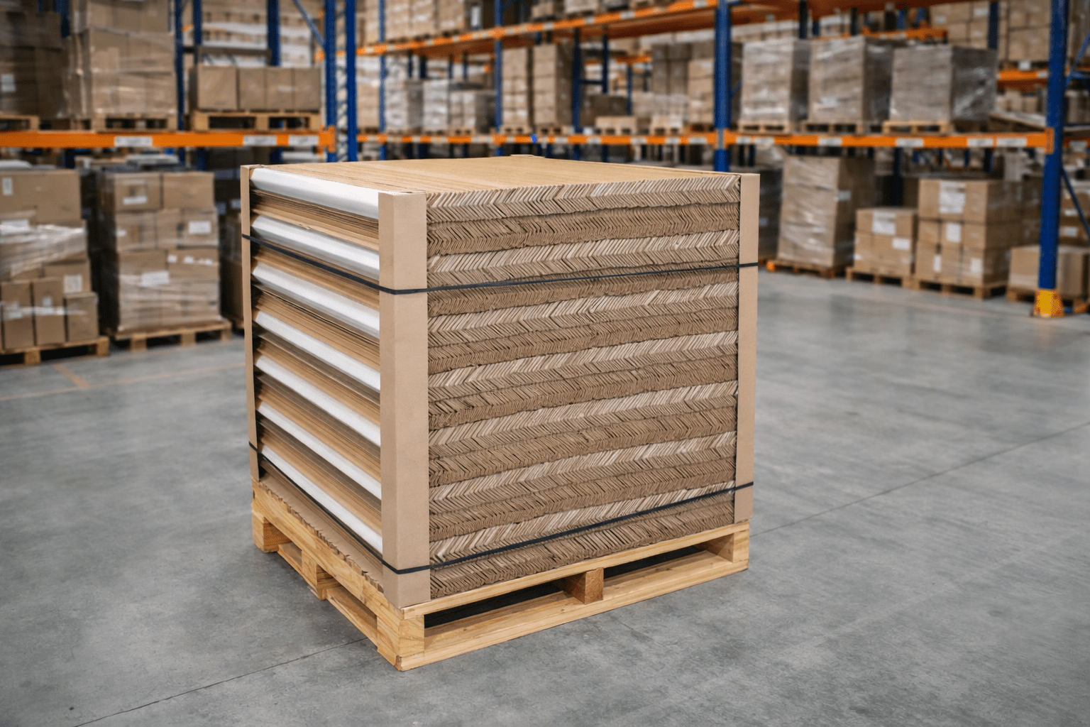 Edgeboard placed on all four edges of a pallet along with strapping protects your products by distributing strap tension evenly across the load, reducing product damage while improving load stability during transport and storage.